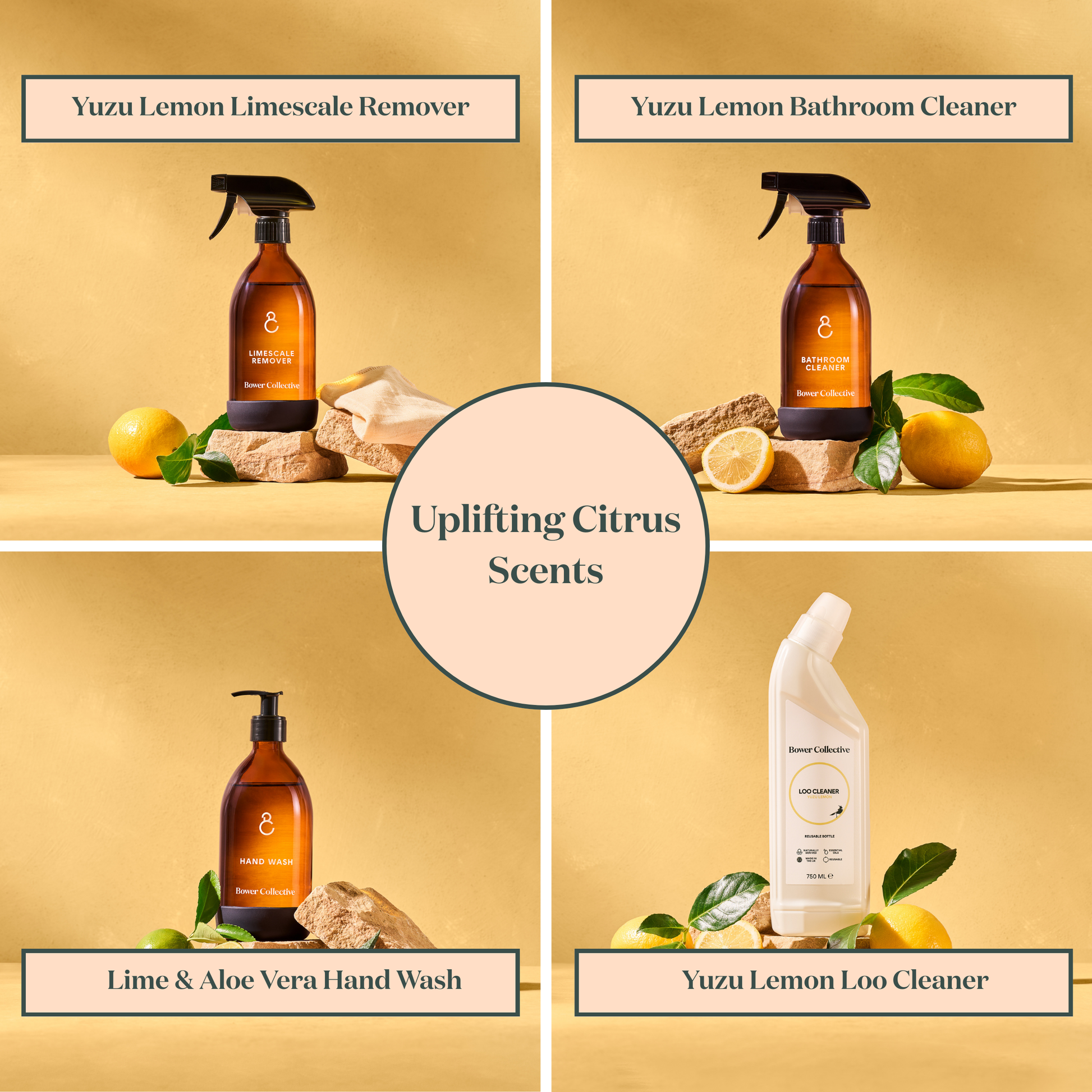 Make bathroom cleaning a feel-good ritual with our Bathroom Retreat Starter Kit, now in an NEW uplifting Yuzu Lemon fragrance inspired by the exotic citrus grown in the peaceful mountains of Japan. This kit includes three FREE amber glass bottles, one toilet cleaner refill bottle and four plant-powered heroes, including: